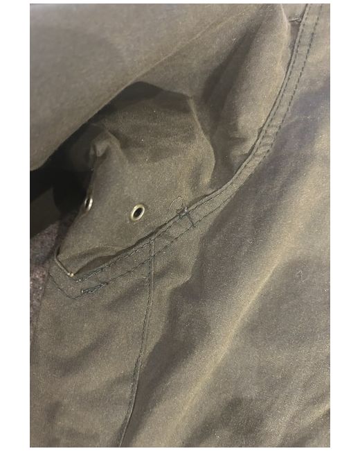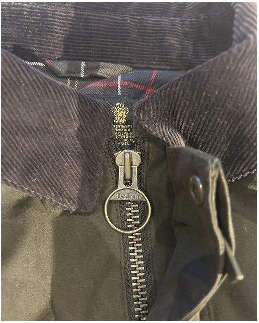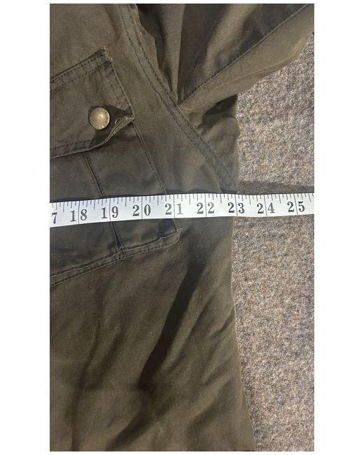 This Barbour Jacket, Large, is made of greeny brown waxed cotton with a slim fit. It features a mid-length design, zip and snap. The jacket has a waxed canvas fabric type , the model is Longstone. I never wore it. So as new. It has the international biker slim design, which comes up on the smaller side. I would say better fit 42-43 chest with slimmer build.