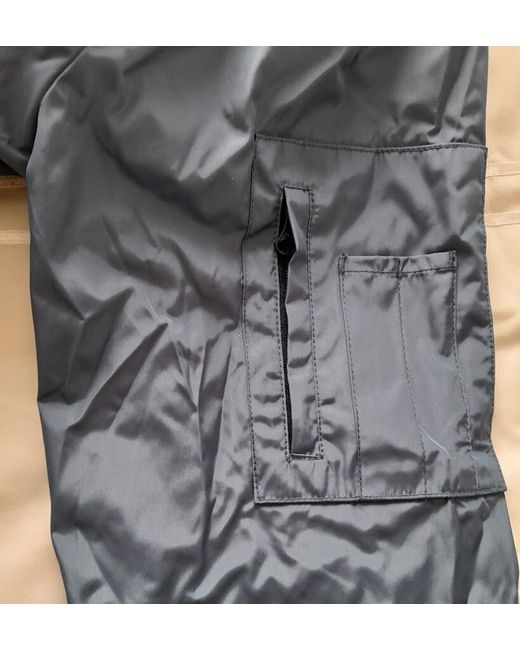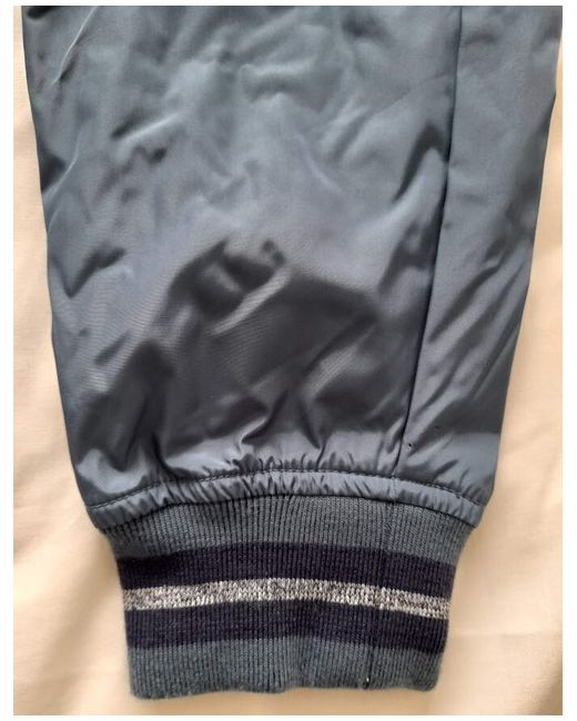 Button side pockets. Size 4 (which is a Large). The total length from the tip of the collar to the bottom of the hem is 29". This Jacket is 100% Polyester outer and 95% inner and is washable. It has elasticated Coller / Waist and Cuffs.