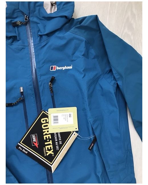 Berghaus Yala Peak Jacket Small New with tags Blue green- more turquoise than in the photos Gore Tex pro shell fabric Roll away hood with collar lining Double front zip 4 outside pockets 1 inside Velcro cuffs Smoke free and pet free household