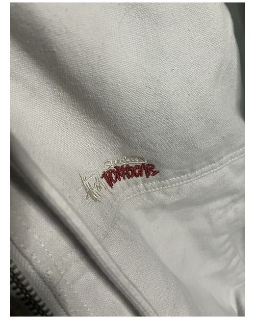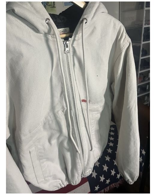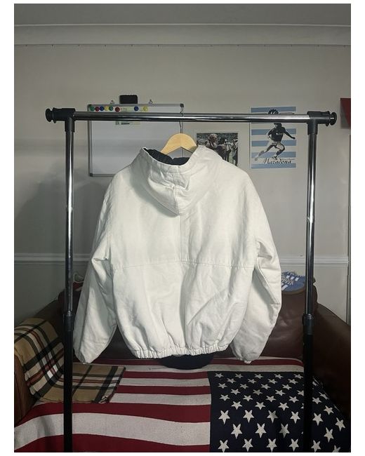 Made from cotton with a polyester lining, this white quilted jacket features a hood for added warmth and protection.