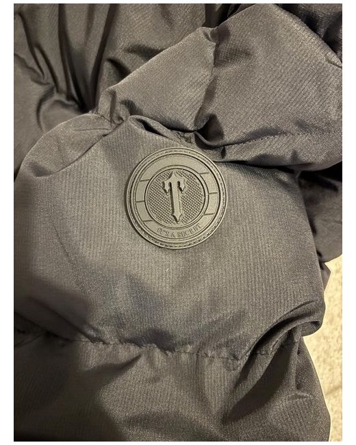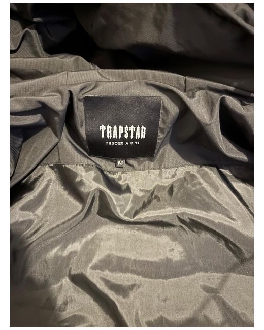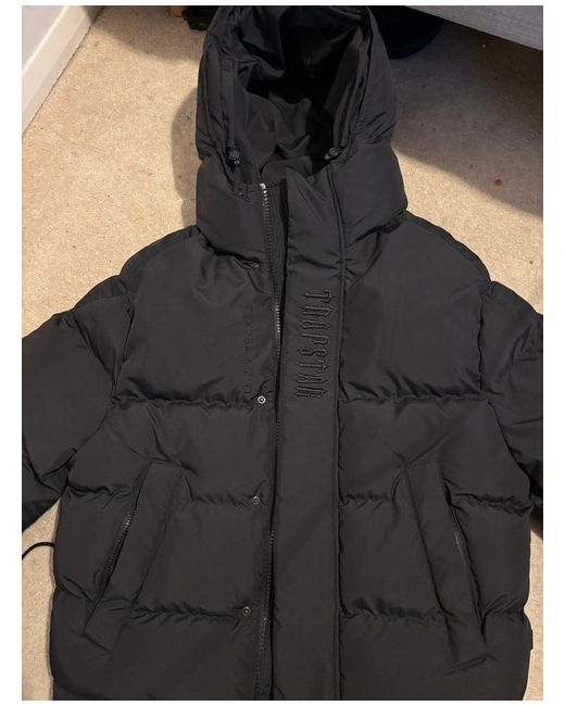 This Trapstar Decoded 2.0 Puffer Jacket in size M is a black winter coat for men. Made of polyester, it features a zip closure, hood, and insulated with polyester. The jacket has a casual style with zip accents, suitable for everyday wear. It is a new item without tags, designed by the brand Trapstar.