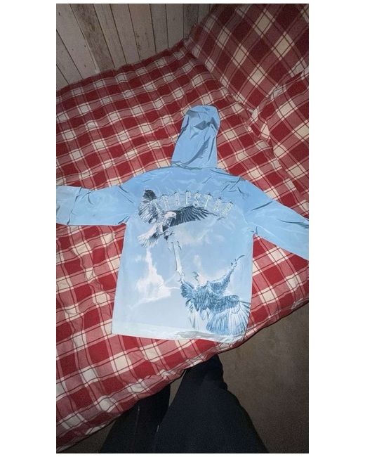 The Trapstar Eagle Windbreaker in white and blue, size M, is a stylish and casual outerwear choice for men. Made from polyester with a zip closure, this windbreaker is perfect for everyday wear or light wind protection. The design features a logo accent, adding a touch of urban flair to the classic windbreaker style. The blue colour adds a pop of colour to any outfit, making it a versatile addition to any wardrobe.
