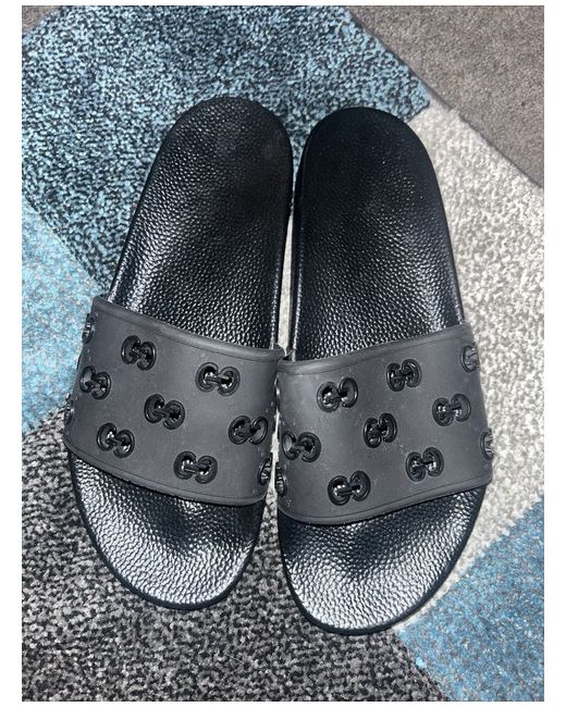 These Gucci sliders in unisex size 6.5/7 are a stylish and comfortable option for casual occasions. Featuring the iconic Gucci logo as accents, these slip-on sandals are perfect for the summer and spring seasons. Made from rubber with a breathable design, they offer comfort and are ideal for men looking for a trendy modern footwear option. Made in Italy, these Gucci sliders are a fashionable addition to any wardrobe.
