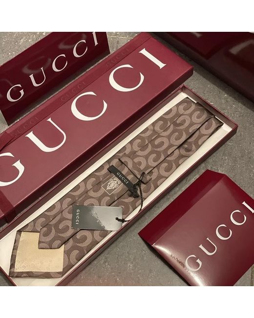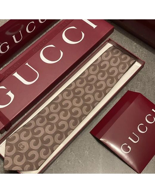 Box and cards not included. Made of high-quality silk, this tie features a striking brown exterior colour with a subtle G pattern.
