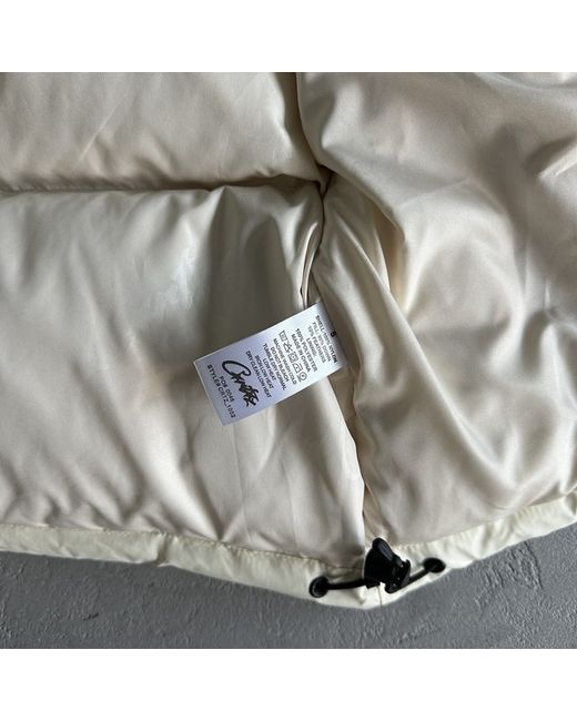 This Corteiz puffer jacket is in size M and in a stylish beige colour. Made of nylon, it is a perfect addition to any man's wardrobe for the colder months. With a regular fit, this jacket offers both warmth and style, making it a versatile and essential piece for any man's outerwear collection. Perfect for casual or smart-casual occasions, this jacket combines fashion and functionality effortlessly.
