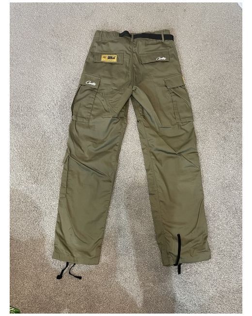 The Men's Khaki Corteiz Cargos in size Medium are a stylish and practical choice for casual occasions. With a cargo style design and cargo pockets, these trousers offer both functionality and fashion. The green colour adds a versatile touch to the outfit, making it easy to mix and match with different tops. The logo accents on the brand add a unique and trendy element to the overall look. Perfect for everyday wear, these trousers are a must-have for any man's wardrobe.