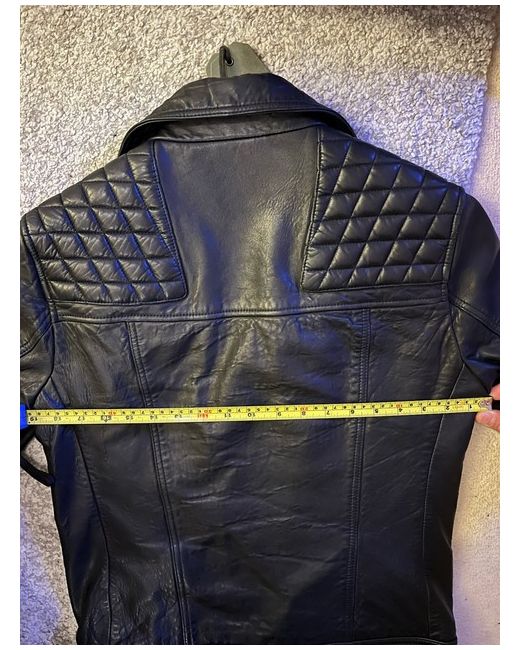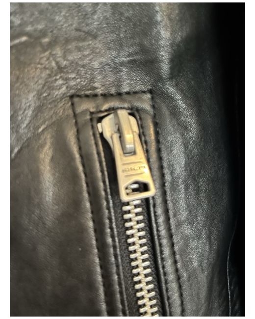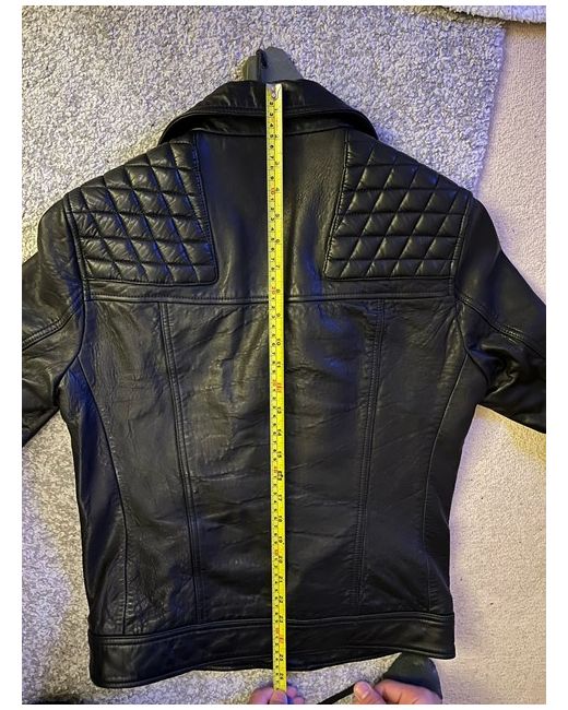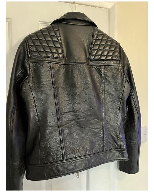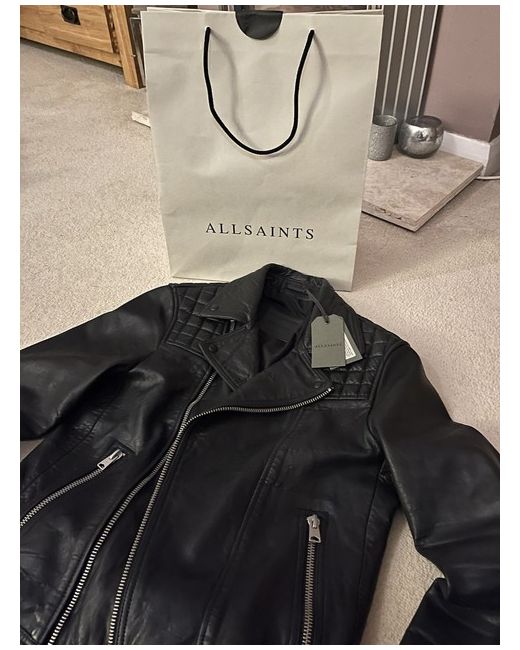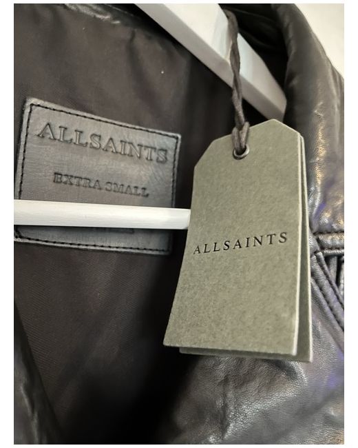 This is an extra small AllSaints leather Cana men's jacket in black. It features a biker style with a collared neckline, full zip closure, and pockets. The mid-length jacket has zip accents and a retail price of £239.