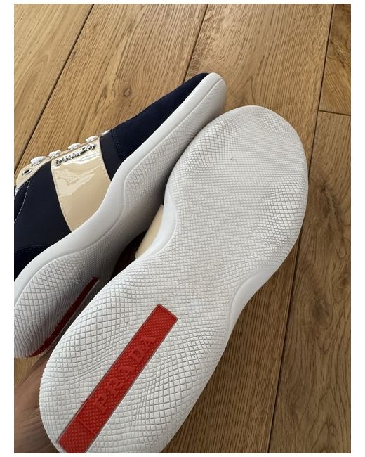 Brand new men's Prada trainers in size 42 in an elegant contrast blue and beige. In a classic design and iconic Prada branding, they are a versatile option for both casual and more dressed-up outfits.