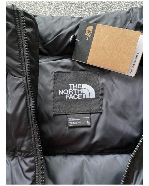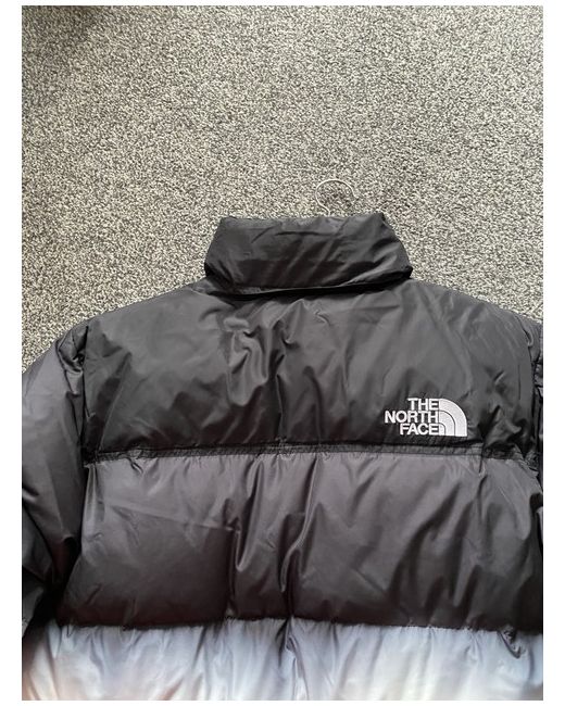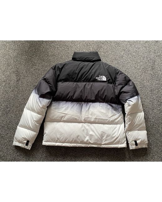 This is a men's medium-sized North Face Nuptse 700 jacket in a fade black style with black and white colours. It is a puffer jacket made of polyester with down insulation, suitable for winter, autumn, and spring seasons. The jacket features a full zip closure, fishtail design, water-resistant properties, and multiple pockets. It is brand new with tags and has a regular fit, ideal for outdoor and city wear.