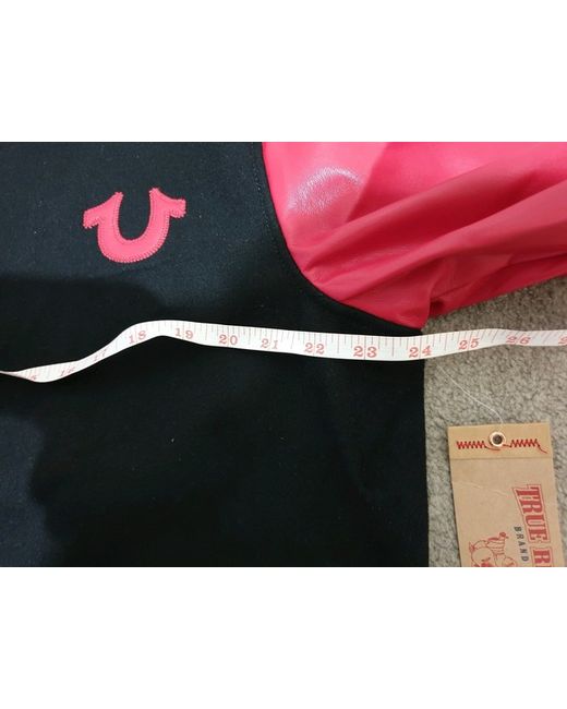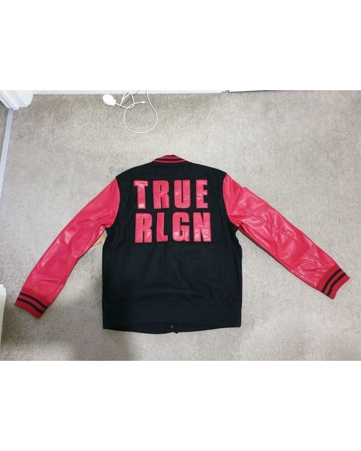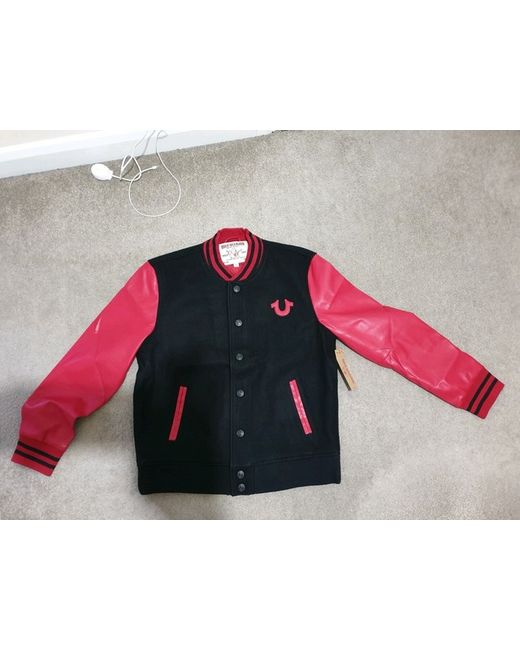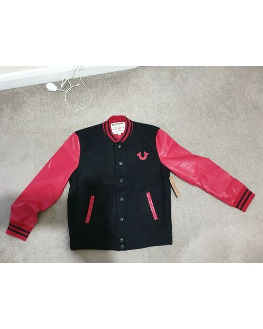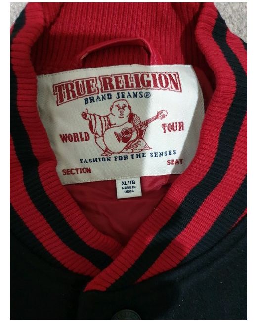TRUE RELIGION MENS BLOCK STACK VARSITY JACKET . Condition is new with tags. DESCRIPTION Play varsity this season. The Mens Block Stack Varsity Jacket features sporty contrast sleeves and contrast ribbing at the collar, wrists, and waistband. This varsity jacket for men is finished with a snap front, hip pockets, and TRUE RLGN lettering across the back. Size XL, pit to pit measurement is 24 inches flat. Note: This is brand new with tags. It has minor scratches or is damaged on one of the sleeves. Thanks.