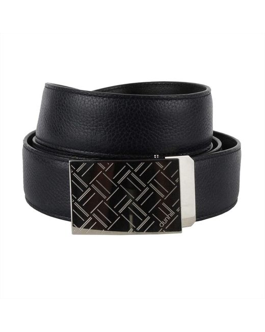 Dunhill Grained Black Leather Belt. Dunhill grained black leather belt. Silver tone buckle with engraved longtail Dunhill logo. Dunhill Tie. Belt can be cut to size by releasing the hinge at the buckle.