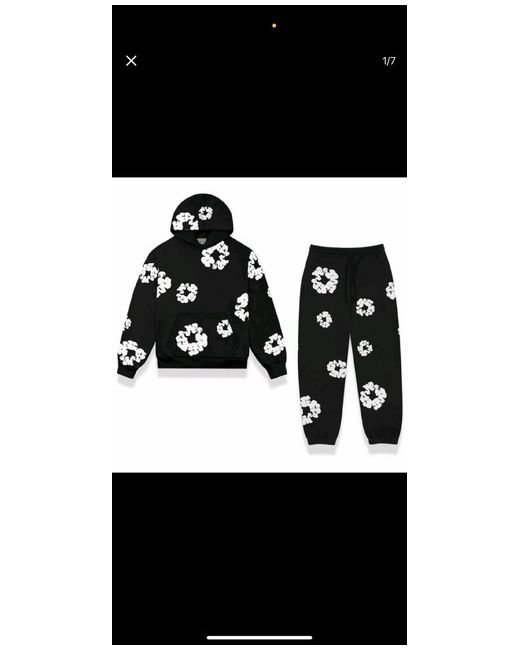 This Denim Tears tracksuit in size M for men features a pullover hoodie with a high neck and embroidered floral accents. The set includes matching track pants, both made of cotton denim fabric with a regular fit. The black tracksuit is perfect for all seasons and activities like walking, school, or dance. The design is inspired by the theme of flowers and the character Astro Boy. Made in the United States.