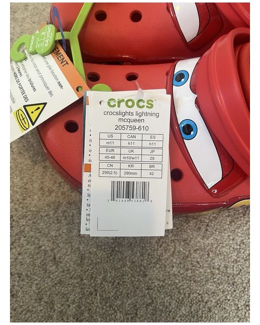These Crocs Disney Pixar Lightning McQueen Clogs in UK size 10 for men are a genuine product featuring the iconic character from the popular movie franchise. Made from durable rubber, these red sneakers are part of the Crocs Classic product line. With a comfortable design and eye-catching style, these clogs are perfect for fans of Lightning McQueen and are sure to make a statement wherever you wear them.