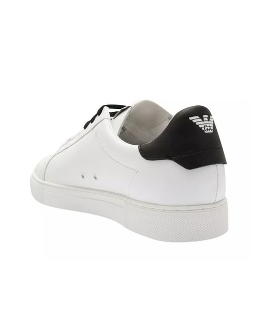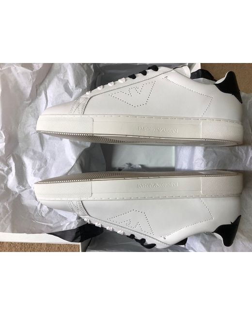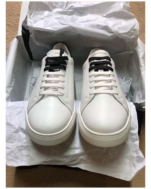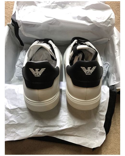 These trainers cost over £180. EMPORIO ARMANI. • Perforated eagle to side. • White and navy laces. • Contrasting heel tab.