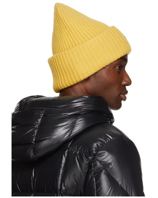 MONCLER Yellow Logo Beanie. ITEM INFO Rib knit virgin wool beanie in yellow. Felted tricolor logo patch at rolled brim. Supplier color: Yellow 100% virgin wool. Made in Moldova.
