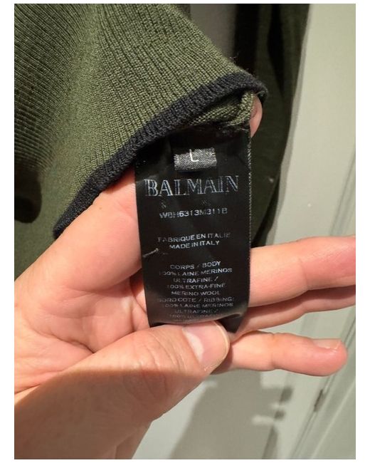 Elevate your wardrobe with this luxurious Balmain knitwear, designed for men in a regular fit and size L. The stunning khaki green colour adds a touch of sophistication to any outfit, while the long sleeves and round neckline provide comfort and practicality. Crafted with high-quality materials, this button-up shirt is perfect for both casual and formal occasions. The iconic Balmain brand adds a touch of elegance to the design, making it a must-have for any fashion-conscious man.