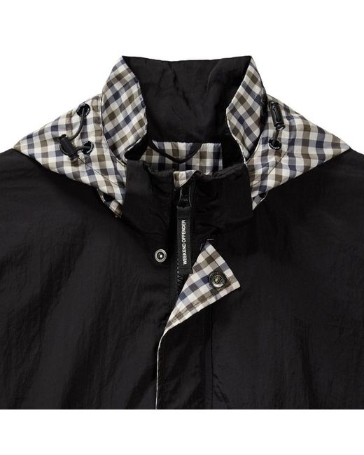 Mid check parachute jacket made from lightweight high density woven 100% Nylon parachute style fabric with lightly reflective surface. ▪ Detachable mid house check hood with adjustable drawcord. ▪ 100% Polyester mid house check details.