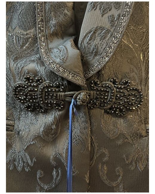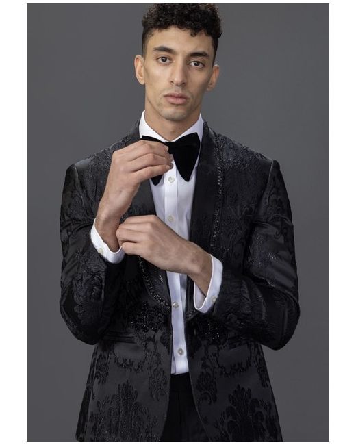 Robert Blazer by Robert Simon Ldn 100% Polyester. Serve the fashion statement of the party with the black glitter Robert Blazer. Size 50” chest. Slim fit - best to size up with this slim for jacket. Sleeve Length (shoulder to cuff) 25.5” jacket length (back) 30.5”. Serve the fashion statement of the party with the black beaded Robert Blazer. Take your fit checks up a notch this festive season and strike your best smile. One button fasten Grey lined pockets Shawl lapel 4 button cuff Single vent Incredible black glitter fabric with floral sparkly detail. Beaded rope trim on shawl collar and pockets. Black beaded rope frog fastening at waist. Double vent at back.