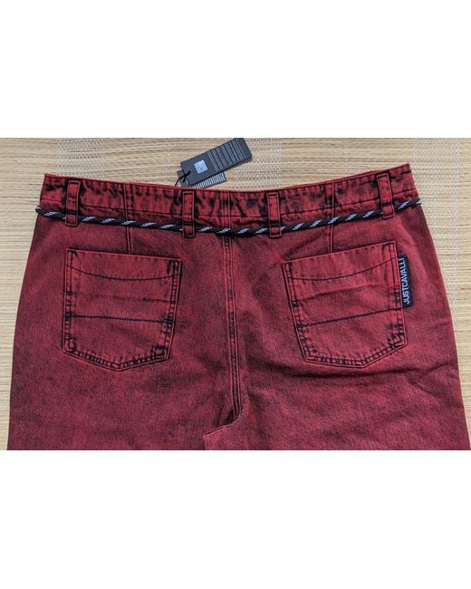 Elevate your denim collection with these Just Cavalli men's jeans, crafted in Italy from high-quality 100% cotton denim in a dark red hue. The relaxed fit and high-rise waist with waist string provide a comfortable and adjustable fit, while the tapered leg and worn look accents add a touch of effortless style. These jeans boast four pockets and a zip closure, and are machine washable for easy care. Available in sizes 48IT and 58IT, with detailed measurements for each size provided. Perfect for any casual occasion, these Just Cavalli jeans are a must-have addition to any fashion-forward man's wardrobe.