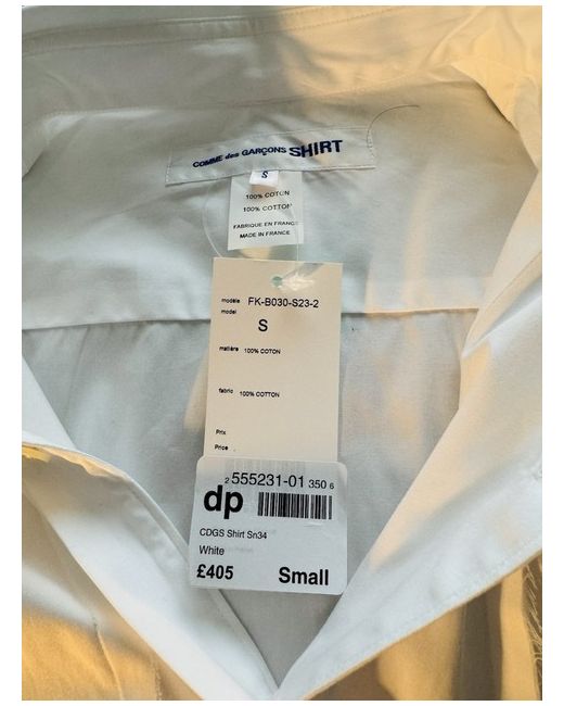 Comme Des Garçons SHIRT. New with label. Colour - white. Material 100% cotton Beautiful long sleeved shirt with pleat detailing on the front which includes frayed edges in the design. Length approximately - 77cm, Armpit to Armpit approximately - 48cm, Arm length - 60cm