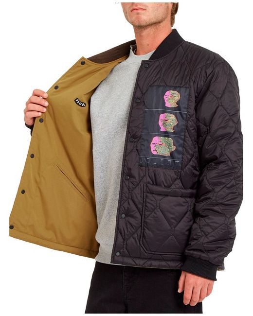 Made with quilted synthetic lining lightweight polyfill. Made from 88% polyester and 12% cotton.. Volcom woven label. Volcom woven patch. Quilted synthetic lining. Front pockets.