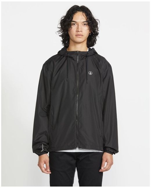 A sporty, water-resistant polyester blend jacket with a DWR finish, relaxed fit, and adjustable hood. Volcom logo at chest and at back. Adjustable hood. Hand pockets. Relaxed fit. Elastic detail at cuff and bottom hem.