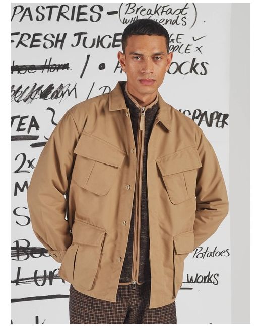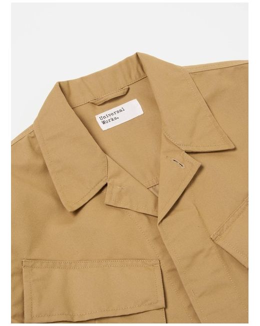 Universal Works Jungle Jacket in Sand Brushed Polytech This jacket is based on the classic US Army Tropical Uniform Jacket, popularised in many movies. In a tightly woven fabric giving a clean utilitarian look which is robust and holds its shape.
