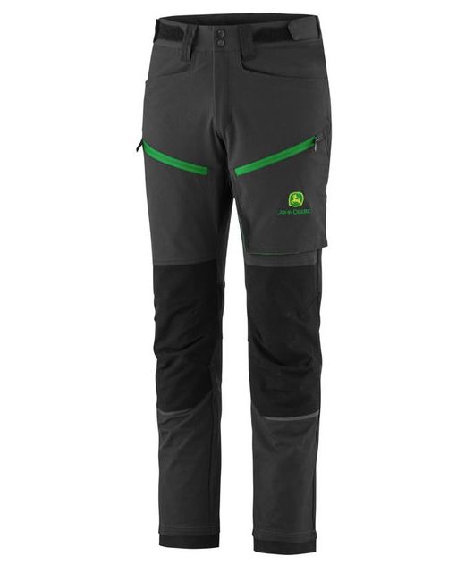2 side pockets, thigh pockets with zipper closure, back pockets with zipper closure, ruler pocket with knife button. Knee pad pouches. Reinforced material on lower leg. Reflective details. Adjustable waist with velcro.