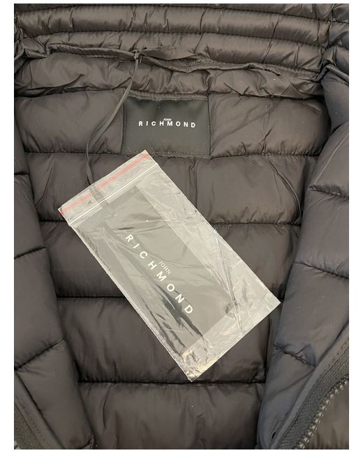This black padded jacket from John Richmond is a stylish addition to any wardrobe. With a stand-up collar, zip closure, and logo accents, it's perfect for both travel and casual occasions. The jacket is made from high-quality nylon and features polyester insulation for warmth in cooler months. The jacket is a size small with a chest size of 40 inches and a short length. It is brand new with tags, and the original retail price was £305. Made in Italy, this jacket is a great choice for those looking for a regular fit puffer jacket that is both fashionable and functional.