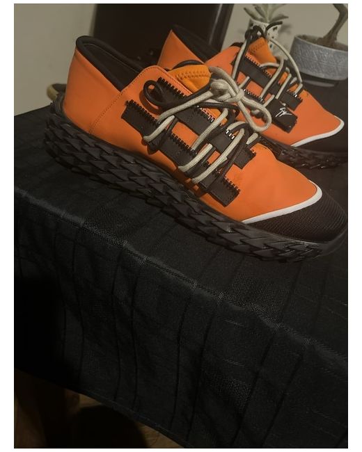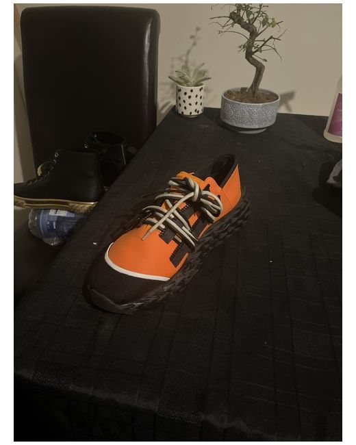 Pair of orange Giuseppe Zanotti Urchin trainers. £500+ brand new. Never worn outside; tried on indoors but they've never felt right on me as I have skinny legs! Ha Listed as "with defects" because the white laces have little discolouration, probably because they've moved home with me twice and got dusty but the upper part of the shoes as well as the sole are immaculate. Size 43 (uk 9)