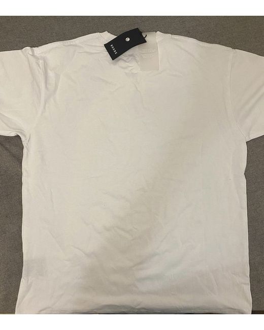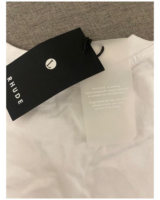 This is a white RHUDE designer t-shirt in size large for men. It is brand new with tags, making it a stylish addition to any wardrobe. The shirt is a regular fit and features the signature RHUDE branding, perfect for those who appreciate luxury streetwear fashion.