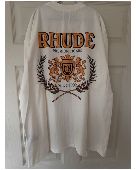 This Rhude t-shirt in beige is new with tags and comes in a size medium. The t-shirt is designed with a relaxed fit, making it comfortable and stylish for men to wear. Made by the brand Rhude, it is a great addition to any wardrobe for those looking for a casual yet trendy t-shirt option.