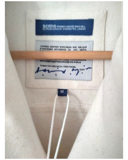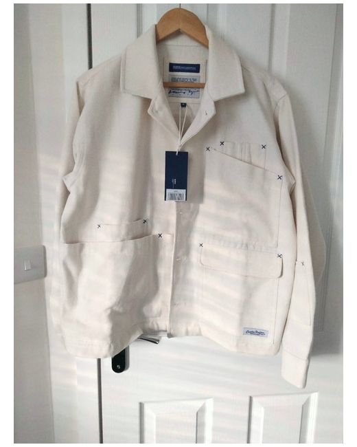 The Creative Uniform Work Jacket in Ecru is a stylish option for men in a regular fit size. This beige jacket is designed for a professional look, suitable for various work environments. The jacket features the brand "&Work" and is a size M. It is a versatile piece that can be paired with different outfits for a smart and polished appearance.