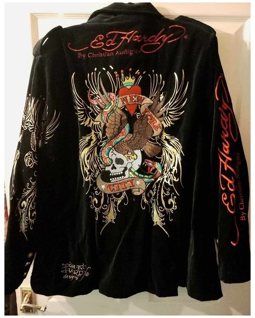 This Ed Hardy blazer is a stylish and unique addition to any man's wardrobe. Made from luxurious black velvet, it exudes a sense of sophistication and edginess. The blazer features intricate art detailing with skull and eagle motifs, adding a bold and artistic touch to the overall design. With a regular fit and size L, this blazer is perfect for making a statement at any formal or casual event. Perfect for those looking to stand out and make a fashion statement. Please order size above if unsure.