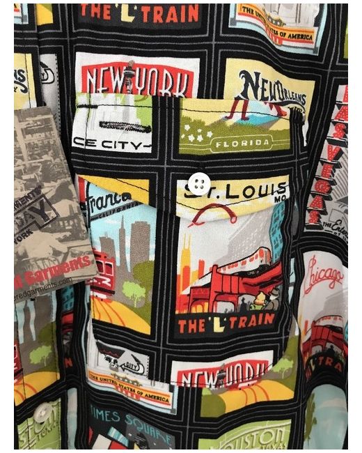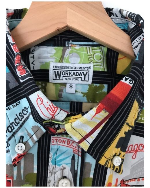 Button down shirt from Engineered Garments. Very practical shirt. Regular fit and is made up in a Black Explore American Print. Placket front. Single chest pocket with a flap and button and pen hole. Button down collar. Button fasten single cuff and curved hem. Size Small. Can fit a Medium. 100% Cotton Made in USA