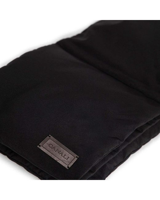 Canali Scarf Canali Black Down Padded ScarfColour: BlackMade in ItalyMaterial: 100% polyester. Padding 100% down. Canali Black Down Padded Scarf. Canali down filled scarf in black. Canali logo in black leather.