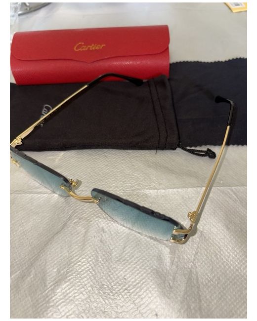 The Cartier Sunglasses are stylish unisex accessories made with a tinted glass lens and a gold metal frame. With a magnification strength of 1, these sunglasses offer a sleek and sophisticated look without any personalised details or pattern. Perfect for adults looking for a classic and timeless eyewear option that combines quality craftsmanship with a touch of luxury.