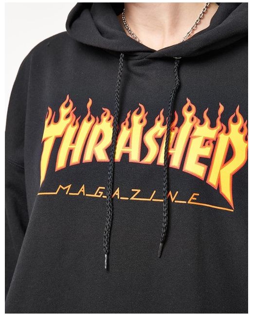 The Thrasher Flame Logo Pullover Hoodie in Black is a re-designed version of the classic Thrasher logo. With 'Thrash and Burn' being the mantra of the magazine, this hoodie fits in with that very well. Featuring a Thrasher Flame logo across the chest, draw string with hood, large front kangaroo style pocket and ribbed cuffs and hem. Made from a cotton/poly mixture. 90% cotton 10% poly.