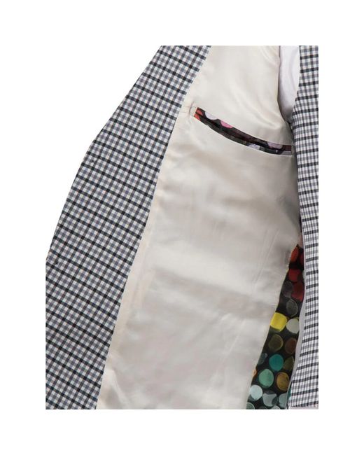 Gingham Check Suit in Grey We have one 44R Suit left the trousers are a 38R. The jacket has notch lapel, twin vents and 2 straight pocket detail. The jacket has a vibrant lining and the chest pocket has a pull out pocket bag to act as a pocket square.