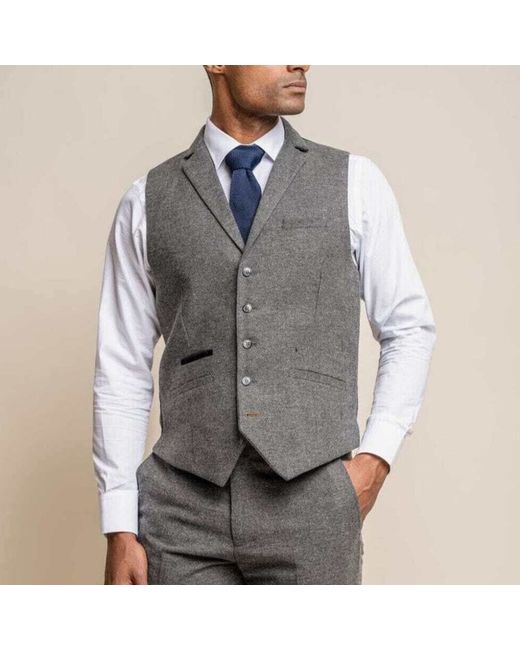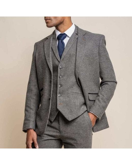 Grey Herringbone Suit Smart Herringbone Grey Suit featuring 2 button jacket, side vents and notch lapel with lapel pin that adds further detail. The slim fitting trouser presents a modern contemporary look.