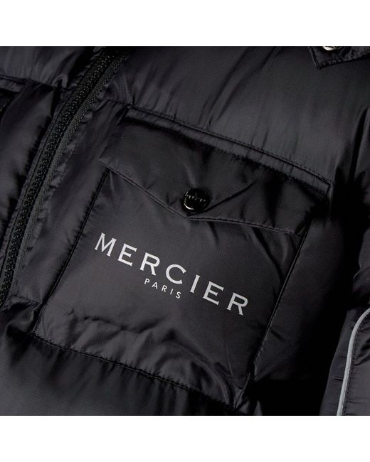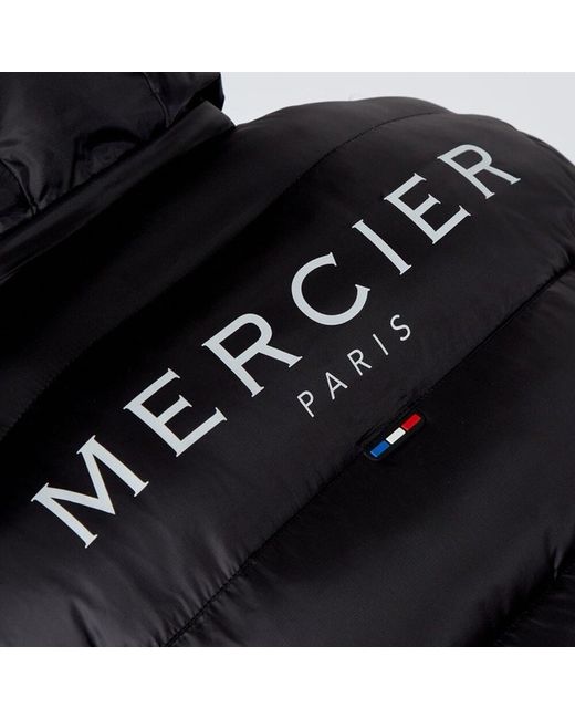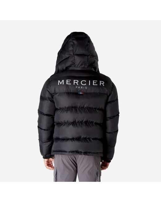 This new Mercier Paris puffer jacket for men (£150 new) is made of black nylon with a softshell fabric type, designed in France. The jacket features an and hooded design, perfect for the winter season. It has a full double zip closure, polyester insulation, and a logo print on the back. The size is medium, never worn.