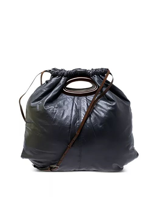 grey leather drawstring closure oval handle detachable adjustable shoulder strap Condition: GOOD. This previously owned and used item is in good condition with minimal signs of use. This may include fading of material or plating and scratches.