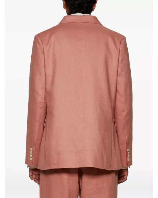 salmon pink double-breasted closure peak lapels welt chest pocket long sleeves straight hem