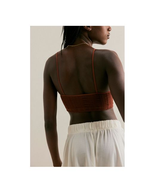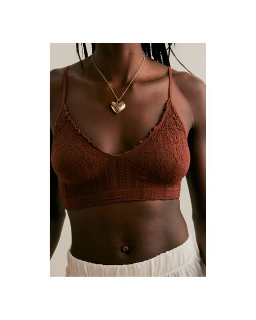 A favorite seamless fabrication gets a textured twist with this longline bralette from Intimately. **Fit:** Bralette style, pull-on design, longline **Features:** Soft, stretchy seamless fabrication, V-neckline, triangle cups, lettuce-edge trim, textured finish, skinny straps **Why We Heirloom Seamless Bralette by Intimately at Free People in Brunette, Size: XS/S