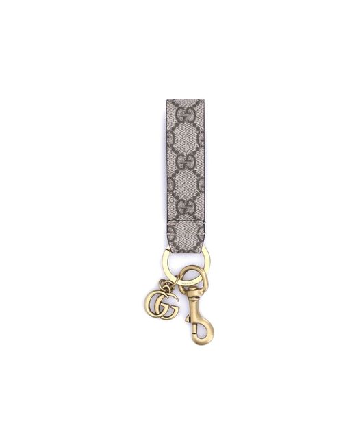 Keychain by Gucci’s Ophidia line, featuring a metal lobster claw ring and the iconic applied metallic GG logo. Complemented by a puller with contrasting GG detail, it represents a refined and functional accessory, perfect for adding a distinctive and recognizable touch to everyday life.