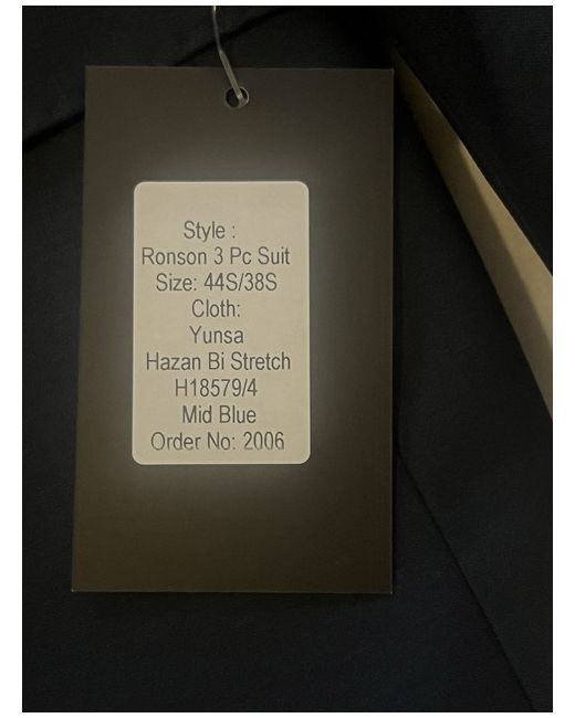 3 Pc Suit. Size 44S/38S Mid Blue Made: Santillini Tailoring