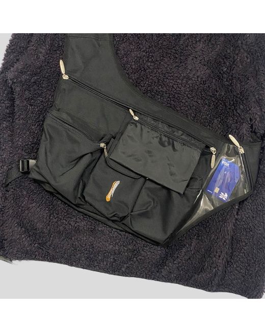 Rare early 2000’s Oxbow Tri-Harness Slingbag, incredible piece from a lesser known 2000’s brand, featuring an exposed PVC zip pocket, numerous multipocket storage options and a removable velcro phone holder on the strap. Embroidered Oxbow logo on the front, metal Oxbow hardwear throughout. Tri-harness strap allows the bag to be worn comfortably on the back, front or side of your body. Also have beige and navy available on my page. (Only one black available) Completely brand new without tags from the early 2000’s, been in storage since new. For sale: £160 all in.