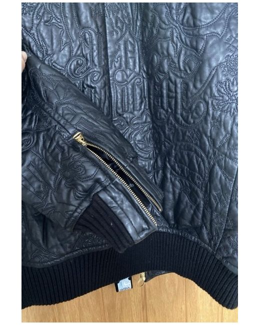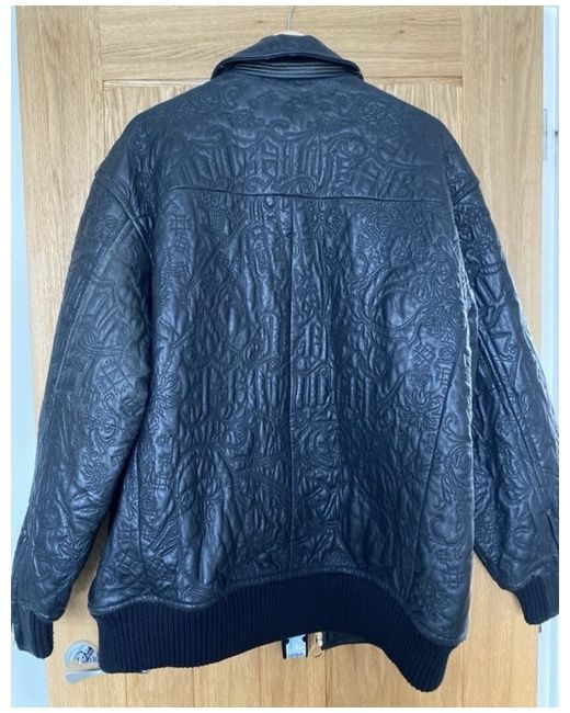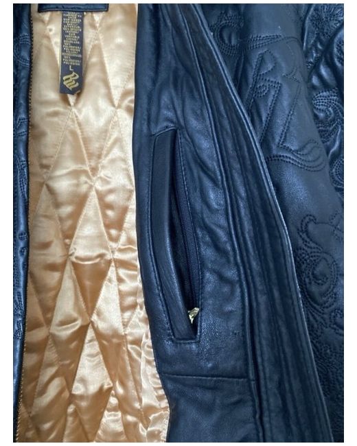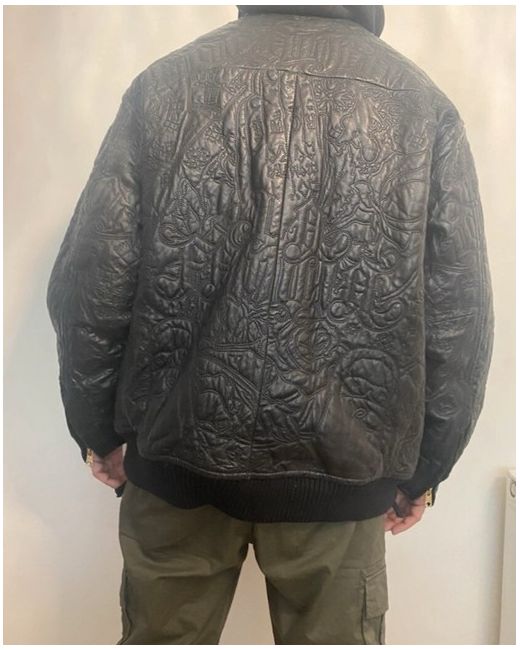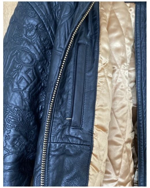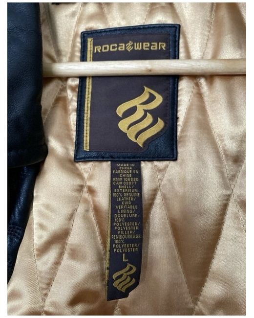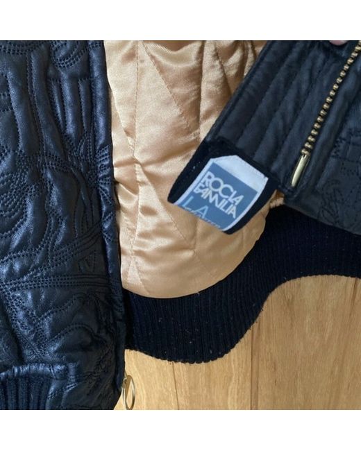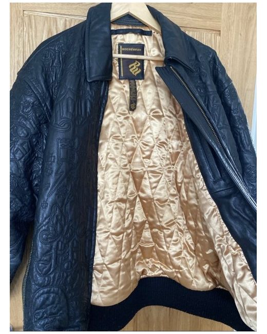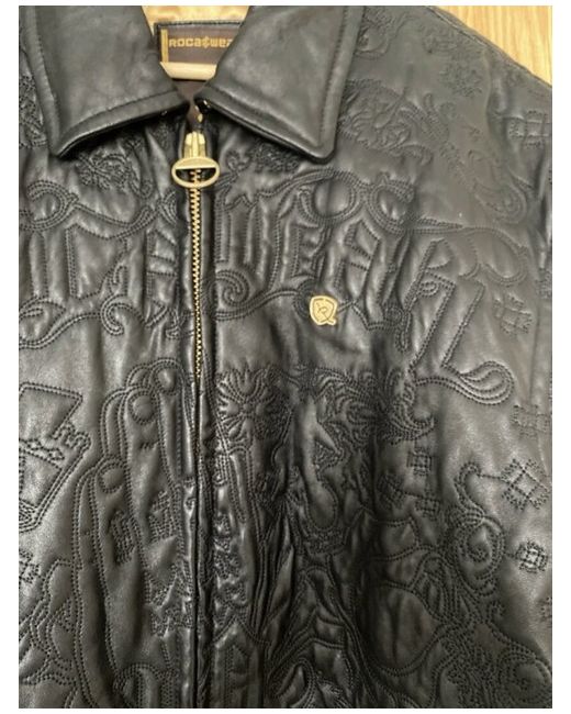 Roca wear black leather jacket with a gold inlay in excellent condition worn only a handful of times. Real leather with a pattern on the entire jacket. Two front pockets and 2 zipped pockets on the inside. The model is 6ft and usually wears size large however wearing a jumper under this jacket so comes up quite big for a large. It was bought from New York so the sizing is an American large. Measurements Chest- 65cm Sleeve length- 64cm Length of jacket- 78cm Back (shoulder width)- 60cm