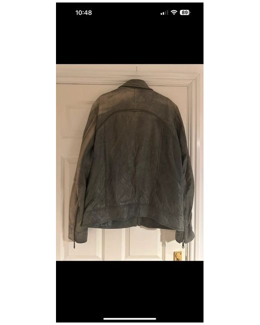 This is a new grey 2XL vegan leather jacket from the brand Kuyichi. It has a zip closure and features accents like zippers. The style of the jacket is a combination of biker, bomber, military, and motorcycle jacket. It is designed for casual occasions and has a vintage look.