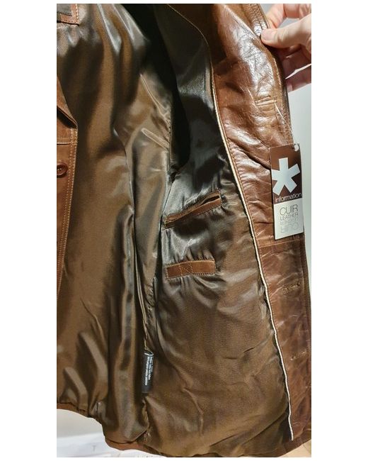 This Celio* jacket is crafted from genuine buffalo brown leather, featuring a biker style with button closure and accents. The size is Large with a regular fit, suitable for casual occasions in autumn and spring. It has a polyester lining, collared design, and is ideal for walking activities. The jacket has a vintage Western theme, making it a stylish addition to any wardrobe, especially for those who appreciate biker or cowboy-inspired fashion. Featuring 2 inside and 2 exterior pockets.